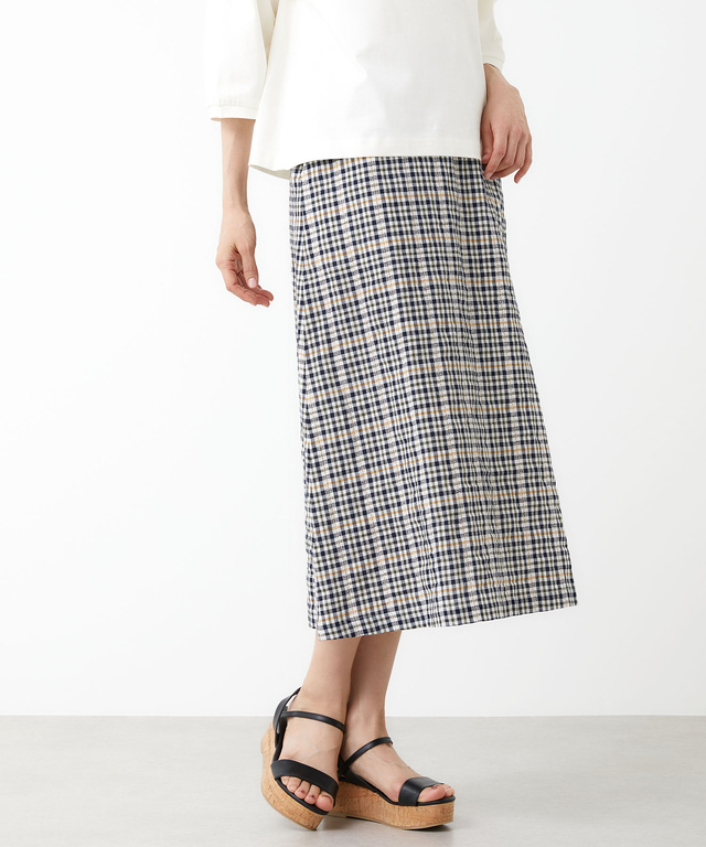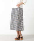 大柄が特徴のクロコダイルタータン生地を使用したウエストゴム入りのフレアスカート。皺になりにくく汚れも取れやすい素材感で、裏地付きなのでデイリー使いにも最適です。