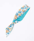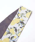 筒の部分に先を入れるだけでおしゃれに簡単に使用していただける形のフルーツモチーフ柄のスカーフ。表の柄は杏子とレモンをモチーフとしたデザインで、裏側はシンプルな単色なので、裏をちらっと見せてもデザインアクセントになるアイテムです。