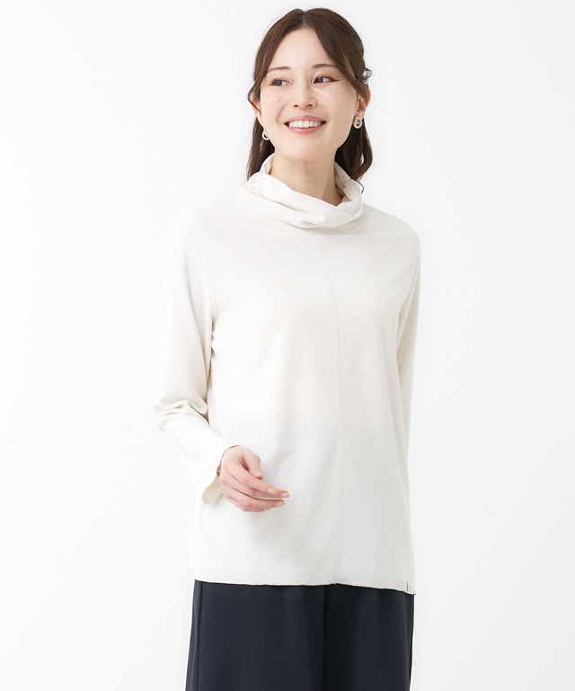 ハイネックにギャザーを入れたカットソー。吸汗速乾・UVカット・抗ピリング・サスティナブルといった機能性や環境配慮にこだわった素材を使用しております。程良いシアー感があり、1枚でもレイヤードコーディネートにもおすすめのアイテムです。
